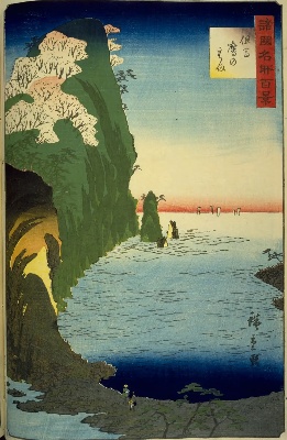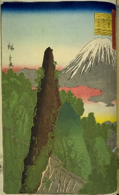 「諸国名所百景」は、歌川広重(二代)が安政6(1859)年から文久元(1861)年にかけて制作した錦絵です。版元は「名所江戸百景」を出版した魚屋栄吉で、彫摺技法にもこだわっています。広重(二代)が二代目を継いで数か月後から制作が始まりました。